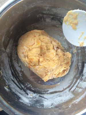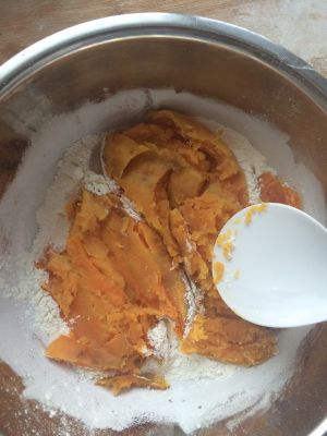 蒸熟的红薯把皮去掉 放在混合好的面粉盆里 用扁勺按一个方向不停的碾压 自然和面粉融合在一起
