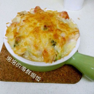 焗盘放入米饭,将炒好的海鲜料盖在饭上,全盖上,看不见饭为止。撒上帕马森干酪。