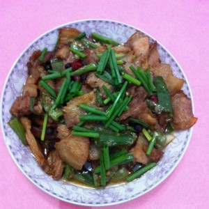 五花肉洗净整块放入锅中,锅中加入水与肉平齐,放入黄酒、生姜丝、整个干红辣椒去腥味。烧至变色用筷子可以刺穿即可出锅、凉干。