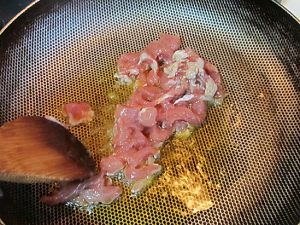 在烧热的锅中放入适量的油(一半普通油和一半辣椒油), 下入腌好的肉丝翻炒;