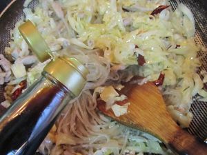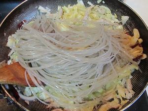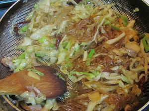 .翻炒出香味后加入泡发好的红薯粉,翻炒几下;