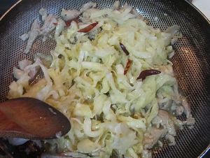 将肉丝翻炒变色, 待肉丝变色后下入切好的泡菜丝和干辣椒丝一起翻炒;