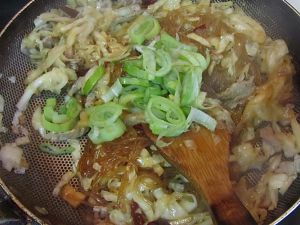 揭开锅盖后加入大葱丝,再加入盐,胡椒,味精等调料翻炒;