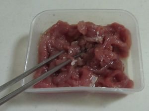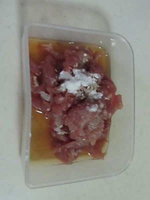 将盐, 生抽, 生粉等适量调味料加入切好的肉丝中;