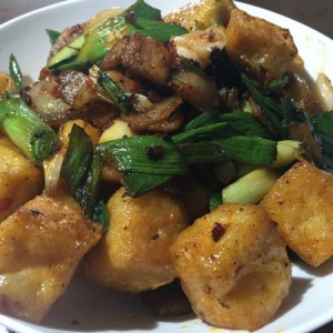 放入豆泡快速炒炒,放入半勺白糖,由于郫县豆瓣很咸,可以不放盐了。