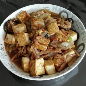 浇上用酱油,耗油,麻油,盐,糖,少许醋制作成的酱汁,加入豆腐翻煮。最后用生粉勾芡。完成。