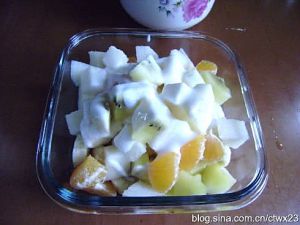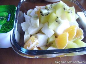 把所有水果丁放在一起,加入酸奶搅拌均匀就可以了。