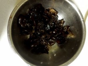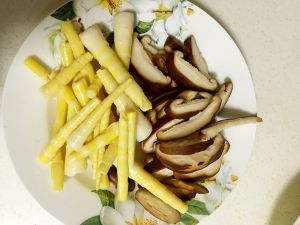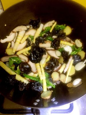 倒入野山笋,香菇炒一下,放一勺盐,再加入木耳爆炒。