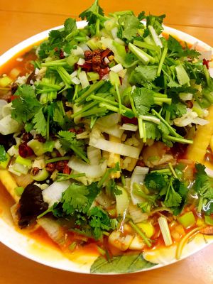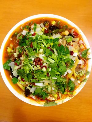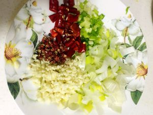 干辣椒、大葱、小葱、花椒、蒜蓉、香菜备用。