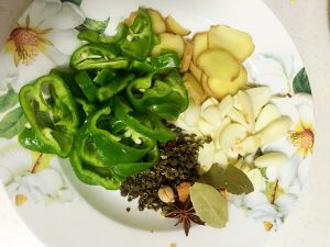 青椒、蒜、生姜、麻椒、香叶、桂皮、八角备用。