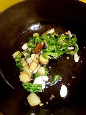 热锅加入猪油化开,倒入青椒、蒜片、姜片、麻椒、桂皮、八角、香叶爆香。