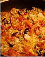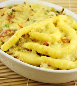 把炒好的饭菜放入焗饭盘中,用裱花袋挤入布丁馅