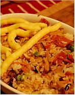 再放入米饭,加入黑胡椒粉,盐翻炒均匀,最后放入鸡精煸炒几下关火