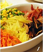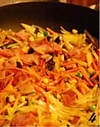 培根用少量油煎一下然后切段,胡萝卜、土豆切丝,香菇泡软切丝,青豆甜玉米粒化冰备用
