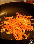 锅内倒油,葱切丝爆香锅底,先放入胡萝卜煸炒