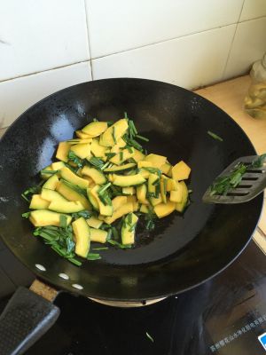 两勺油烧热,韭菜南瓜一起下锅。加盐,大火迅速翻炒,加一勺鲜酱油。炒至南瓜片有点软就行,不要过火。