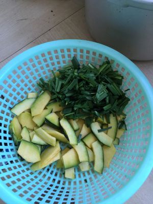 嫩南瓜洗净切薄片,勿去皮。十几二十根韭菜洗净切小段。