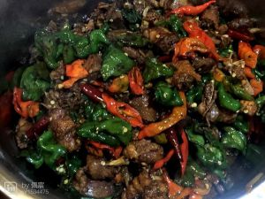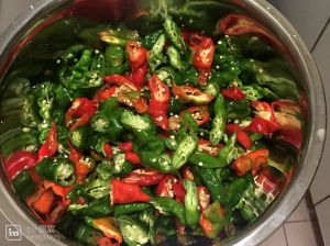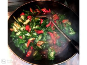待汤汁浓稠时,加入辣椒、小米椒、盐,继续翻炒,直至辣椒看起来有点儿蔫儿了。