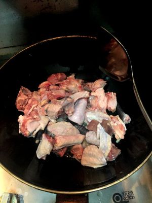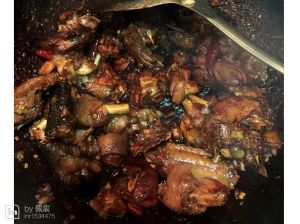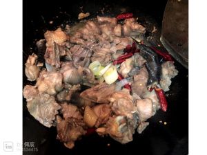 鸡块倒入锅中,大火不停翻炒,直至将鸡肉的水分炒干。