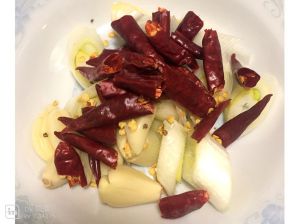 葱切段;大蒜拍一下即可;姜切片;干辣椒掰成段。