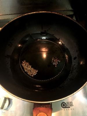 热锅凉油,放入花椒、八角,小火炸出香味儿后捞出。