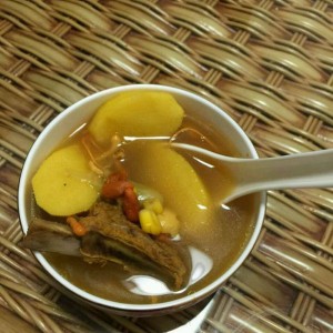 3.在加入切好的山药和玉米段,少量盐慢炖半小时之后放少量味精和鸡精。