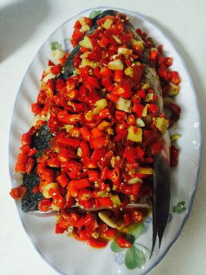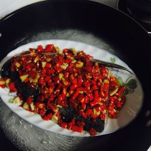 将炒好的红辣椒和剁椒铺在已腌制好的鱼头上面