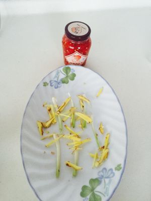 将鱼头、红辣椒、姜、蒜、葱洗净备用,然后在盆底铺点姜丝和葱段