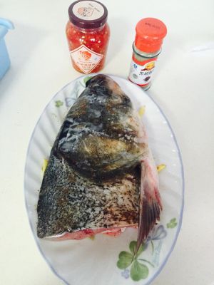 将洗净的鱼头放在已铺的姜丝和葱段上面,然后再鱼头上抹上适量的盐和胡椒粉,然后喷点料酒,腌制十几分钟