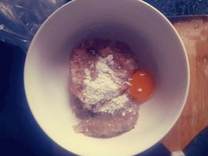虾用刀背剁成泥,瘦肉剁成泥,打入蛋黄,加入适量的淀粉和盐,搅拌成馅