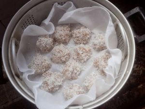 把之前做好的馅泥用勺子弄成球形,放在大米上裹一层,放入蒸锅