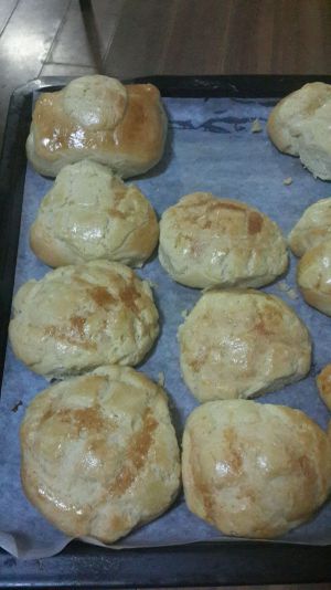 面团二次发酵后分成剂,把酥皮也分成同样数量的小剂,压成皮包裹住面团。放烤箱上下火160度预热,烤三十分钟。(上色后盖锡纸。)我的一共分成十一个,一整盘,先烤了二十分钟,没熟,又加了时间才行。