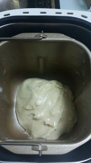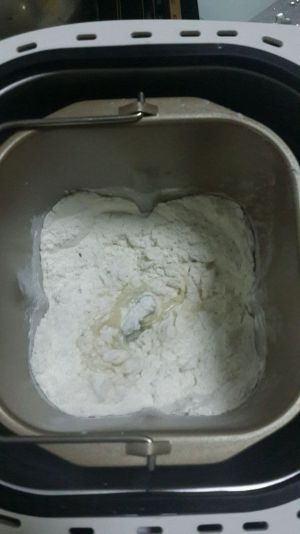 除黄油外,材料都倒入面包桶,和面20分钟放入黄油。再和面30分钟。