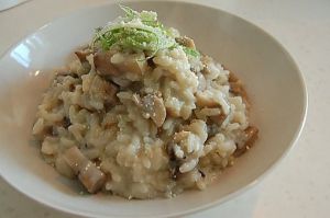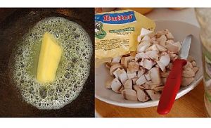 用1:1的黄油和橄榄油炒洋葱碎和鲜口蘑粒。锅不要烧的太热,否则含奶丰富的黄油会变糊变黑。