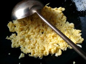 将鸡蛋碎扒拉到锅边,放入葱碎和十三香,翻炒几下,