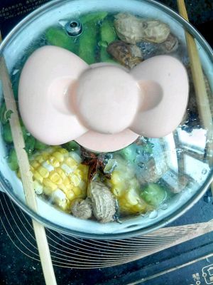 锅里放水没过所有材料,开大火煮开后小火煮熟~(我的是煮了半个小时,住的时候用筷子把锅盖支起来一点可以让煮好的毛豆颜色漂亮一点儿。那个大蝴蝶结是我的小锅盖子把手,表误会~)