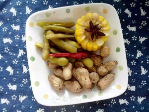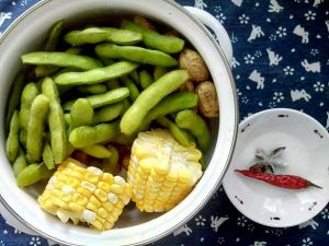 花生、毛豆、玉米洗干净;花生稍微捏个小口子,毛豆剪掉两边方便入味;玉米剁成小段~