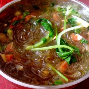 在锅中倒入高汤或白开水(我用的是家里中午剩下的秋葵汤),加入自己喜欢的青菜,等汤滚开,将那碗调好的酱料倒入,再次烧开