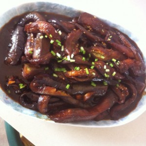我茄子是整个的,中间切开,一个茄子我分九伴,不要切到头上,热锅放油(油多放点茄子吸油),油热了放蒜瓣(切的碎一点),有香味出来放茄子翻炒(最好用不粘锅烧),煸到茄子扁扁的,放老抽、糖、生抽上色,在加大半碗水,盖锅焖煮。