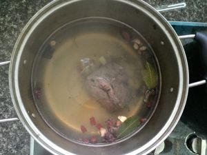把腌好的牛肉放入锅中,加水,水里加酱油,黄豆酱,适量盐,再放入一点儿香料,水开后打掉水面上的血沫。继续小火煮。