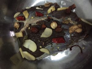 把泡好的牛肉晾干,均匀抹上白酒,给它按摩保证酒味渗进去,再均匀抹上盐和酱油,最后用蒜,干辣椒,花椒,八角,桂皮等香料腌制好。放冰箱里一晚保证有足够的时间吸收味道。