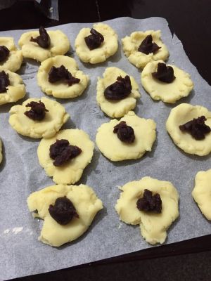 我用的是30g的模具 称30g绿豆蓉 8g红豆沙 包裹住后压花