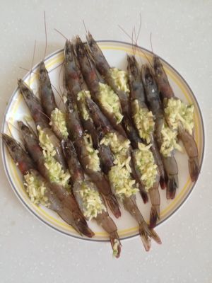 把拌好的材料填入虾背中