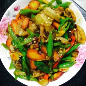 加适量油 将肉片下锅炒至金黄出油 加入姜蒜片炒出香味 再加豆瓣酱和料酒 混合炒香后 加入辣椒和胡萝卜片一起炒3分钟左右
