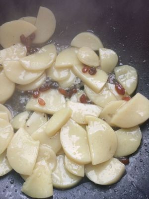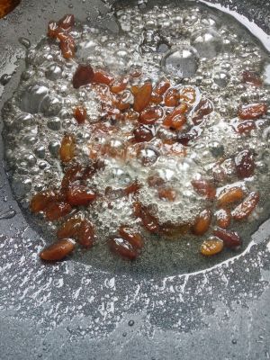 糖炒一下后加入水炒化后,加人葡萄干,煮到如图片这样大泡沫说明浓度够了