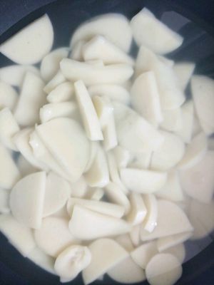 买来如果表面硬了,可以切片后蒸下,然后用冷水洗下让年糕片片分开等下更好炒