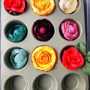 牛奶加细砂糖,完全溶解后,加淡奶油,蛋黄和低粉拌匀,过筛。将卷好的苹果花放在里面,拌好的蛋挞水浇在里面,七八分满即可
