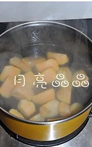 水开后,番薯快速刨皮切块(动作慢了番薯接触空