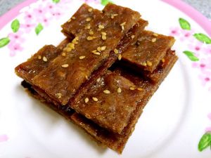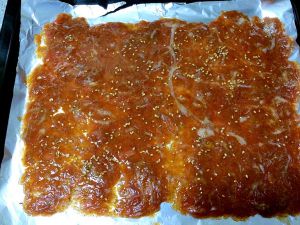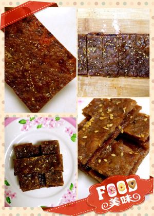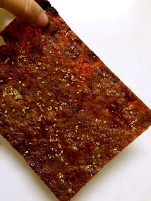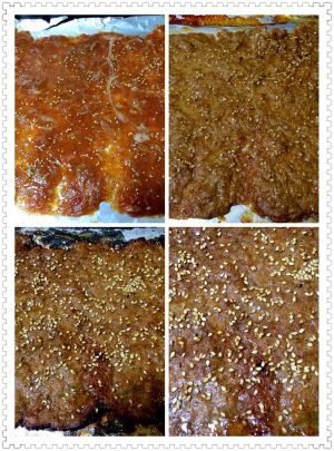 将擀好的肉薄饼连同锡纸放入烤盘,揭开保鲜膜,在肉饼上均匀撒上白芝麻。将另2勺蜂蜜稀释成蜂蜜水,均匀涂抹于肉饼表面。