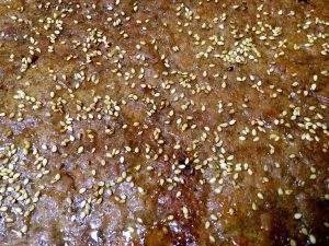 将取出后的肉饼翻面,均匀撒上白芝麻,刷上蜂蜜水,继续放入烤箱,烘烤10分钟。
